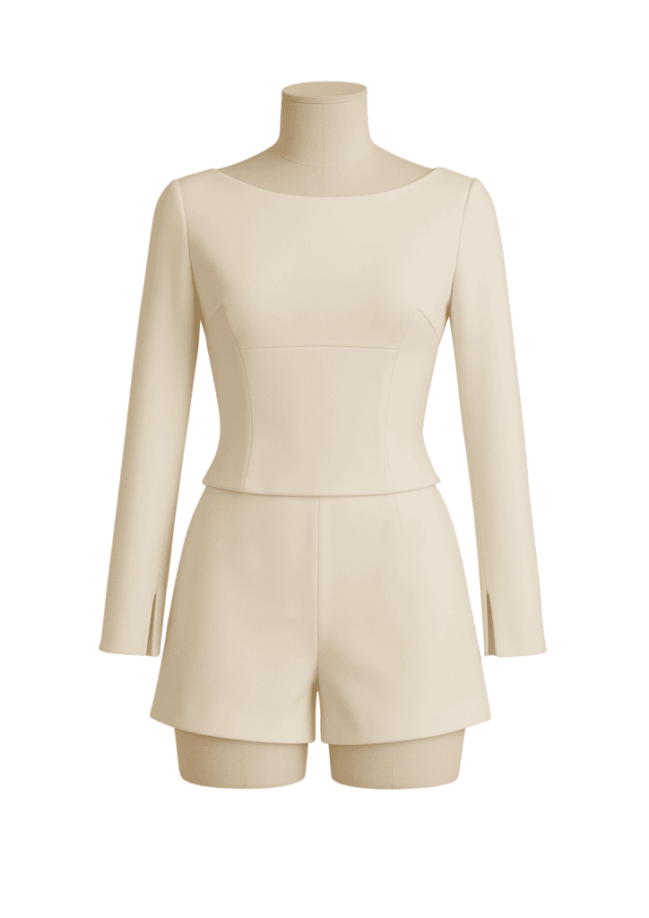 Il nuovo set ha un’aura fresca, urbana e disinvolta: un look contemporaneo che trasforma l’eleganza formale in un’eleganza funzionale, pronta per il giorno e per la sera. Anche qui, le decorazioni originali sono state rimosse dalle maniche e dalla vita, mentre il resto della parte superiore resta intatta.