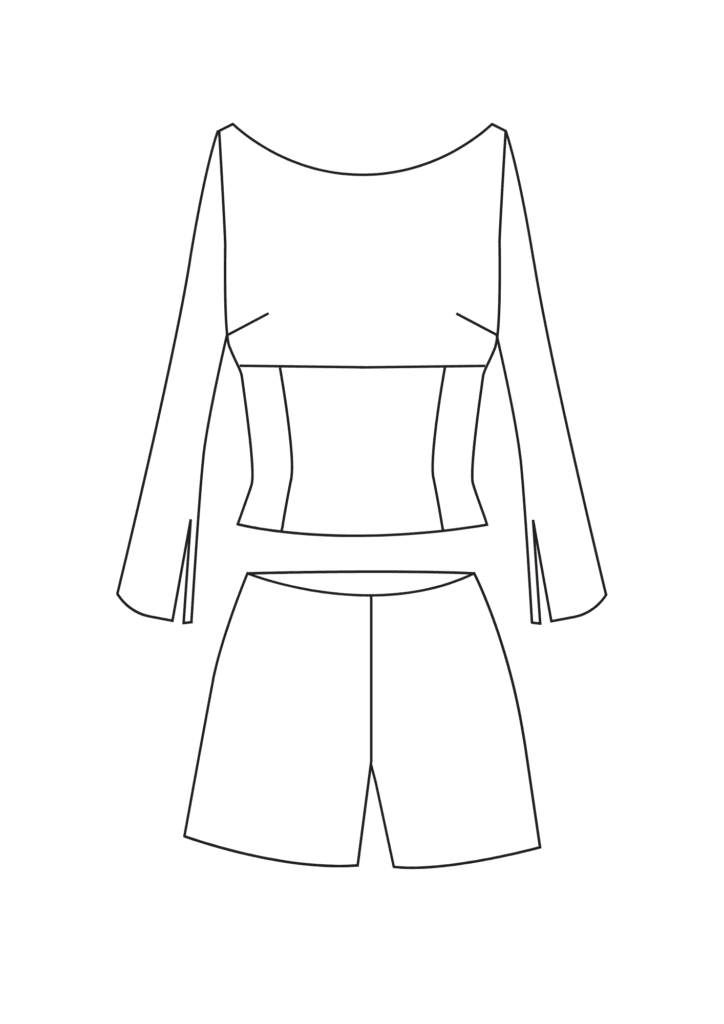 L’abito da cerimonia, romantico e tradizionale, viene destrutturato e ricomposto in un completo top + pantaloncini dal taglio netto e deciso.
