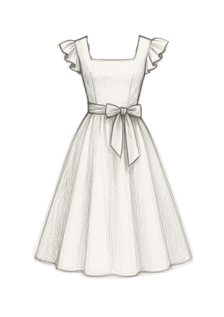 Le maniche lunghe sono state rimosse e rielaborate per dare vita a delicati volant, che aggiungono movimento e un tocco romantico al capo. Lo scollo è stato ridisegnato in una forma quadrata per valorizzare il décolleté, dando maggiore struttura e modernità all’insieme.