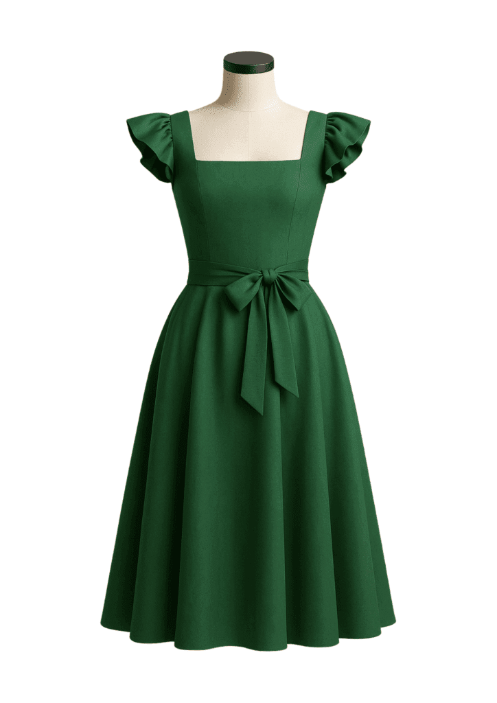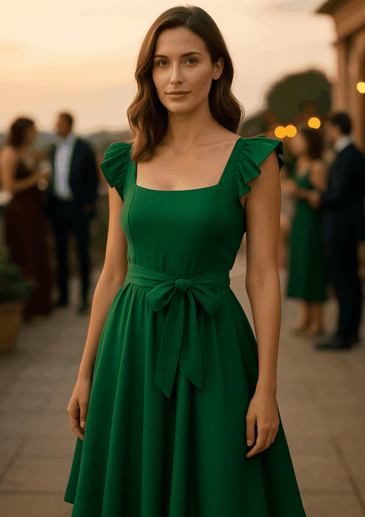 L’ abito verde è stato trasformato in un capo fresco, femminile e dall’eleganza intramontabile. La silhouette, pur mantenendo la cintura annodata in vita, è armonizzata con una nuova linea più leggera e ariosa.