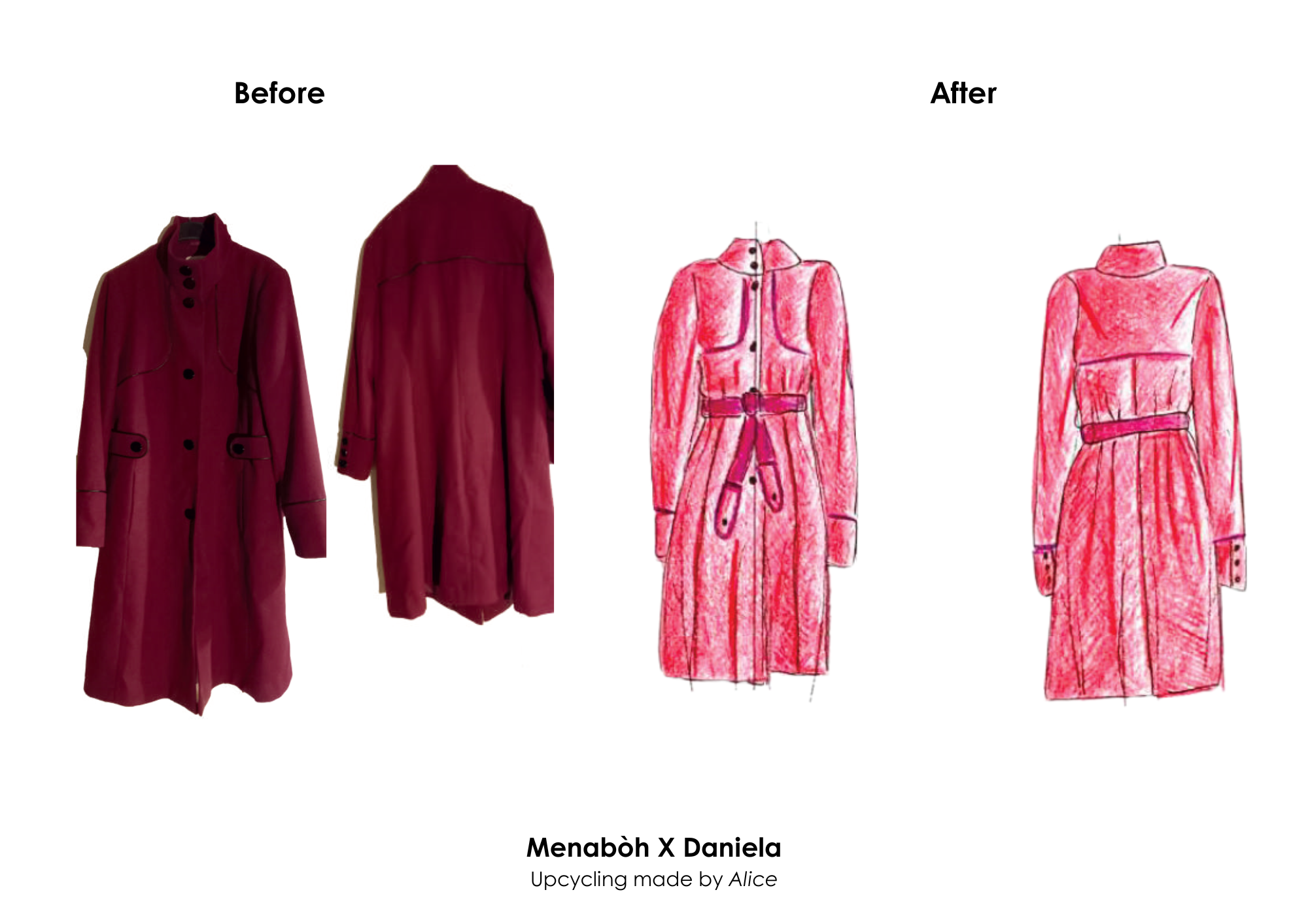 To best emphasise the customer's physique, the work involves reducing the shoulder and moving the armholes. In addition, to emphasise the waistline, a belt is created by recovering the elements on the front and a new fabric is used to match the detailing.