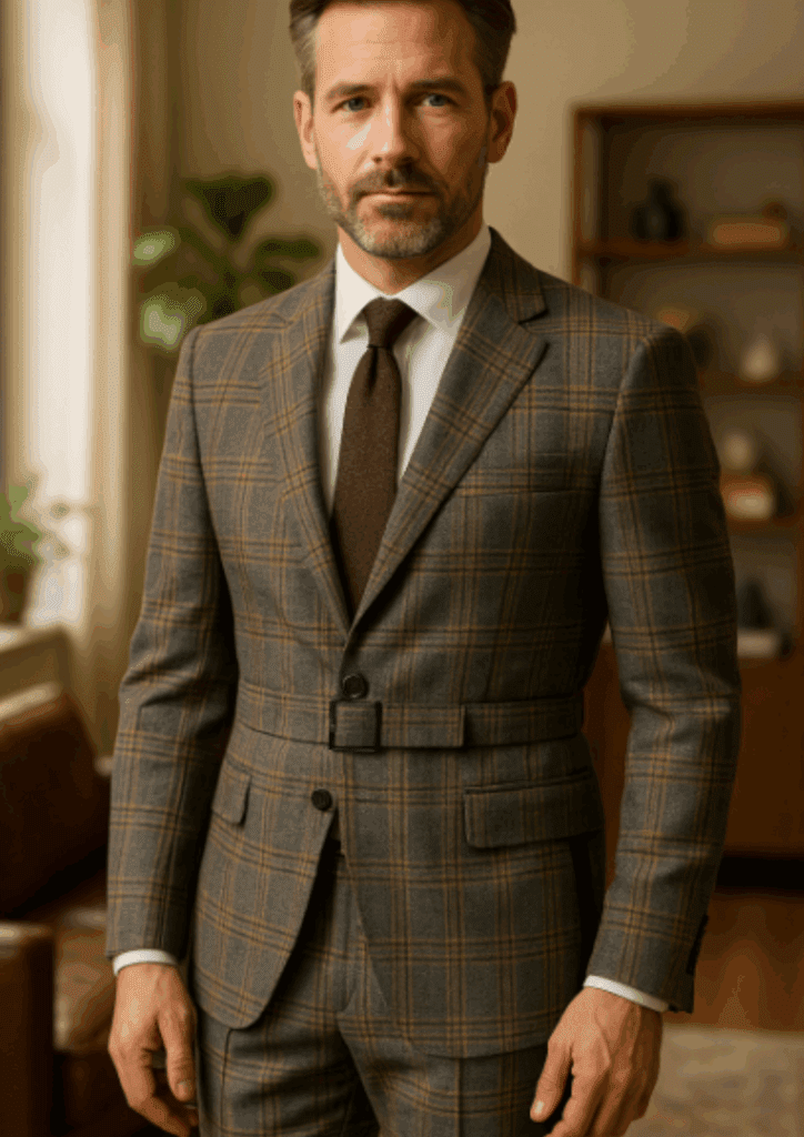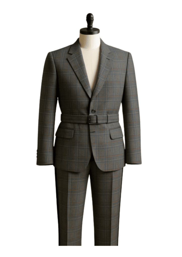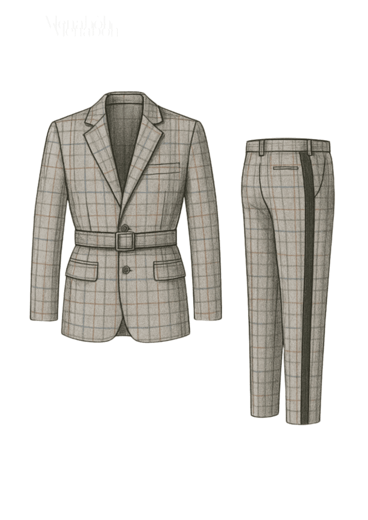 Accessorio coordinato — dal tessuto ritagliato della giacca verrà realizzata una cintura con fibbia, per completare il look con un dettaglio unico e personalizzato.
