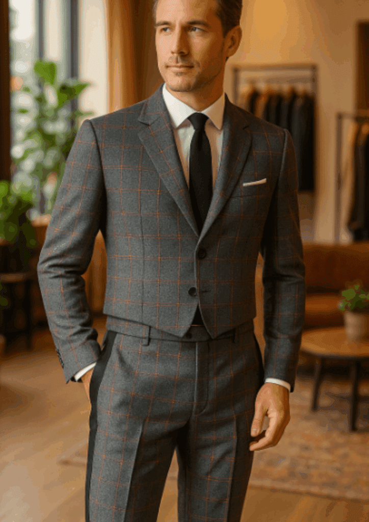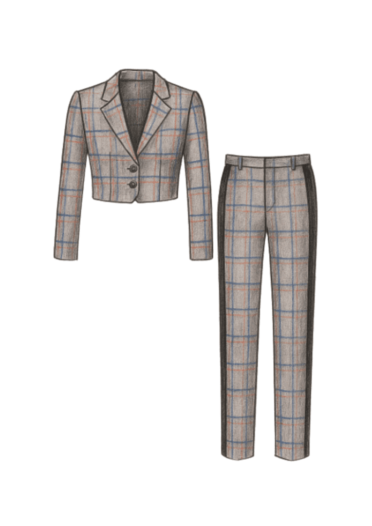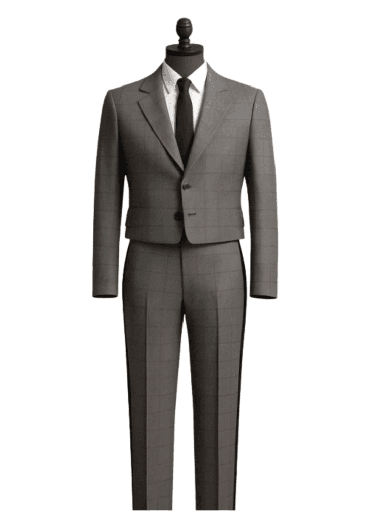 Chiusura — il davanti sarà leggermente ristretto e verrà creata una nuova abbottonatura, con bottoni rivestiti nello stesso tessuto della giacca per un effetto coordinato e sartoriale.