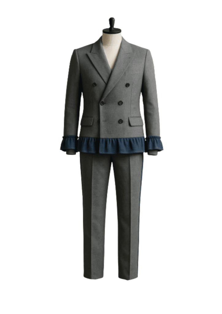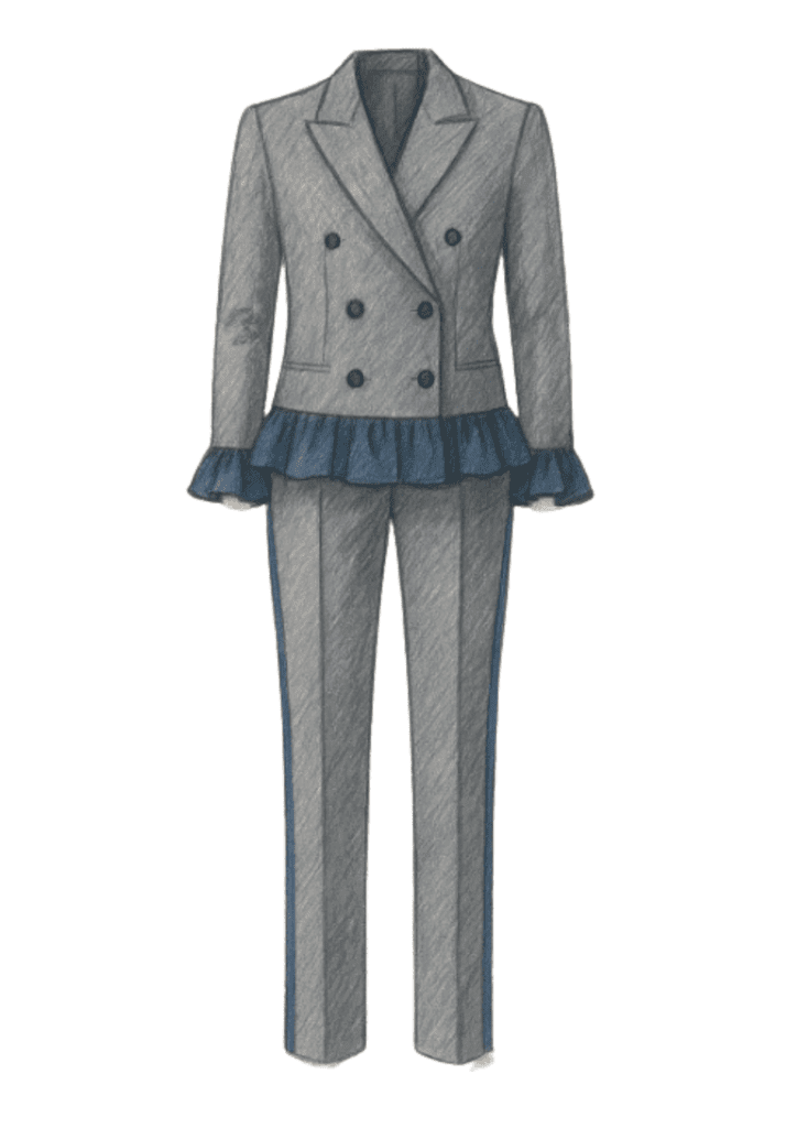 Giacca doppiopetto — il fondo sarà accorciato per alleggerire la linea e ridefinire le proporzioni, mentre rouches in denim verranno applicate sia sul fondo della giacca che sul fondo delle maniche, aggiungendo movimento e un tocco femminile e inaspettato.