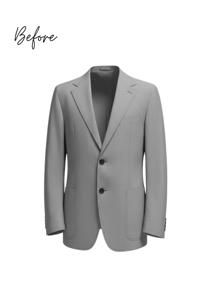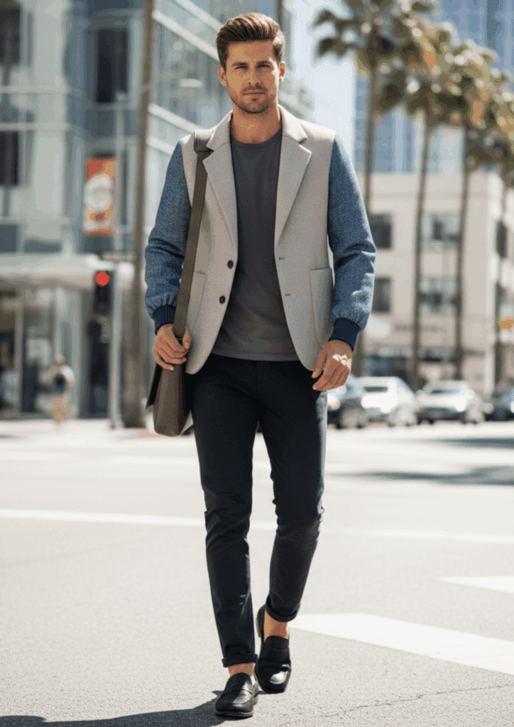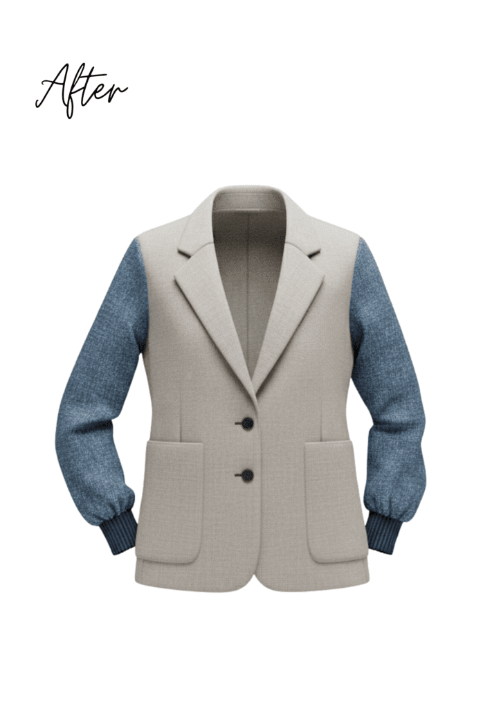 Trasformazione della giacca in chiave sporty-chic: le maniche originali vengono sostituite con denim, mentre sui polsi vengono inseriti dettagli in tessuto felpa effetto bomber, per un contrasto moderno e dinamico.