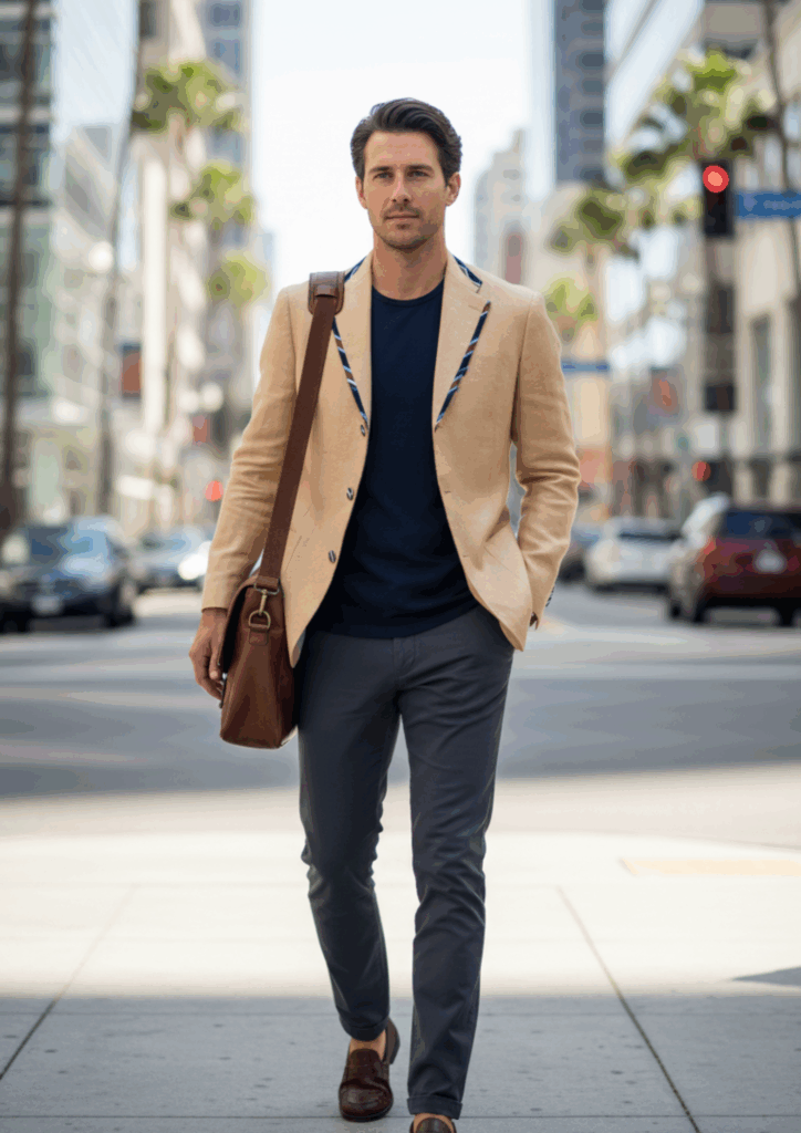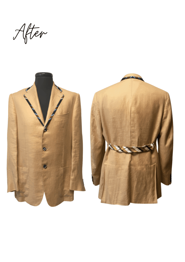 Il blazer è stato modernizzato utilizzando scarti di cravatte per i dettagli di finitura. I bordini in tessuto di cravatta rifiniscono elegantemente sia il rever che il colletto, mentre i tre bottoni frontali sono stati rivestiti per un look omogeneo. Un cinturino decorativo, anch’esso ricavato dalle cravatte, è stato applicato sul retro, completando la trasformazione del capo con un tocco unico e sostenibile.