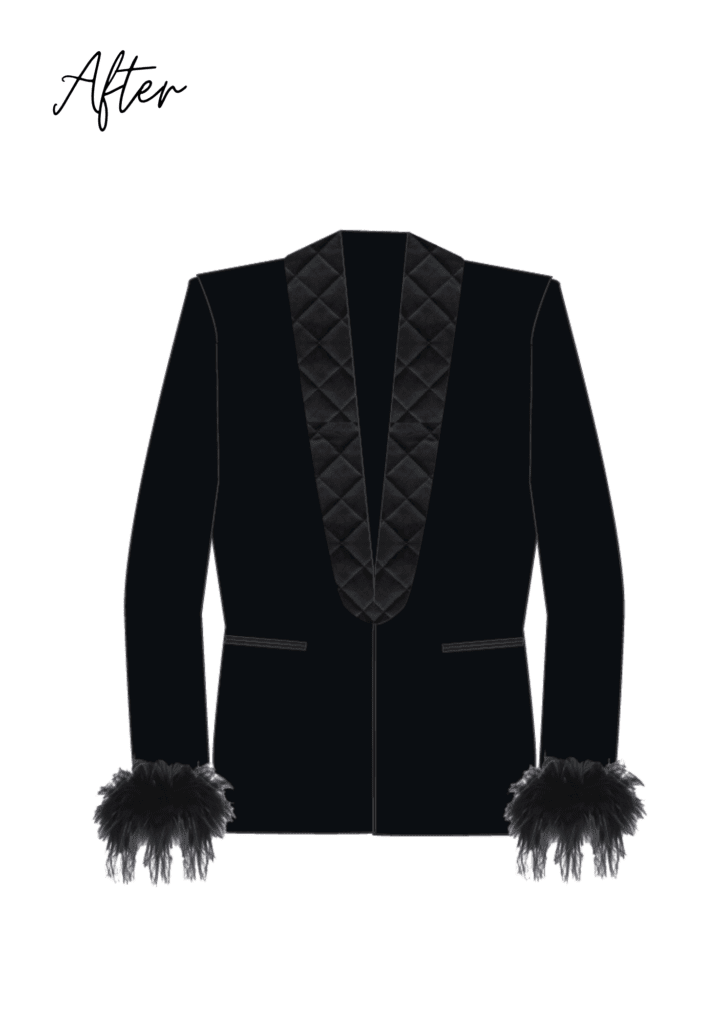Il rever viene rivestito con un tessuto in velluto a quadrati leggermente in rilievo, che ne sottolinea la raffinatezza. Le maniche acquistano movimento grazie a più fasce di tulle applicate al posto dell’abbottonatura, regalando leggerezza e un tocco di teatralità. Il risultato è uno stile completamente nuovo, che valorizza il collo e rinnova l’identità della giacca. Come dettaglio opzionale, il bottone potrà essere sostituito: con ganci interni per un effetto minimal, oppure con un bottone dorato per una nota luminosa e preziosa.