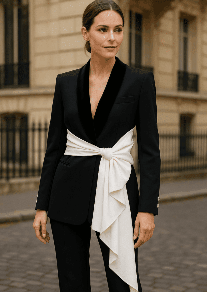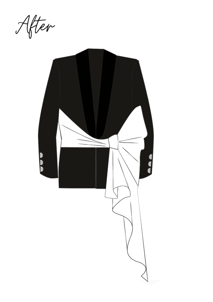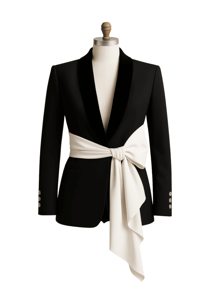 Il rever viene rivestito con un velluto classico, che ne esalta la profondità e il contrasto materico. I bottoni delle maniche vengono sostituiti con bottoni gioiello, piccoli dettagli luminosi che aggiungono un tocco prezioso. A completare la trasformazione, una fascia drappeggiata in vita che si conclude con un fiocco scenografico, asimmetrico, da cui scende un pendente in tessuto bianco: un elemento inatteso che rende il capo elegante e al tempo stesso sorprendente.