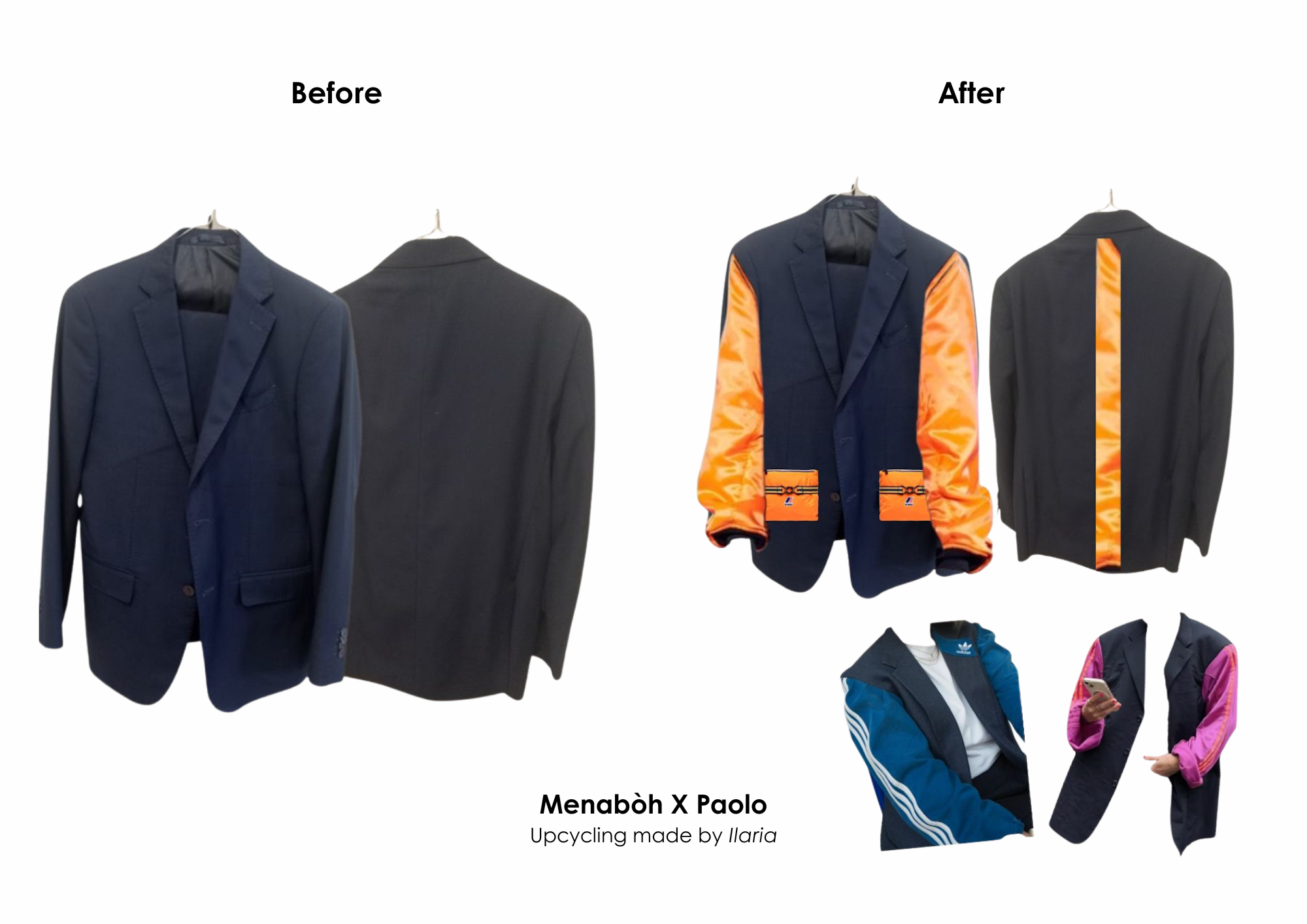 Trasformazione di una giacca elegante in un capo dallo stile street, con maniche, tasche e schiena realizzate in un tessuto tecnico sportivo – da definire successivamente insieme al cliente.