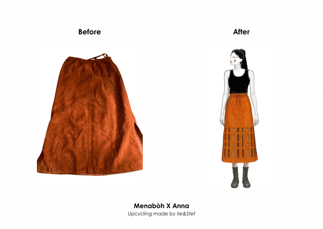 La lunghezza della gonna resterà invariata. La parte inferiore, a partire dalla cucitura trasversale, sarà caratterizzata da intagli rettangolari di diverse dimensioni, disposti in colonne prevalentemente verticali e regolari, che creano un effetto grafico e arioso. Questa lavorazione in stile cut-out dona leggerezza visiva e dinamismo al capo. La lunghezza e i piccoli spacchi laterali contribuiranno a facilitare il movimento, ispirandosi a linee architettoniche. Anche in questo caso, la fodera verrà rimossa nella parte inferiore per valorizzare la trasparenza degli intagli.