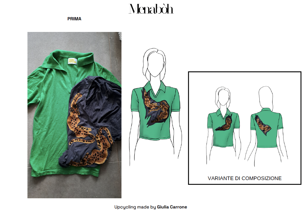 This proposal involves a different application technique: instead of sewing the embroidery on top of the green t-shirt, a portion of the embroidered shirt is applied underneath the green one, from which the same portion is cut off. The customer can choose between the two suggested variants.