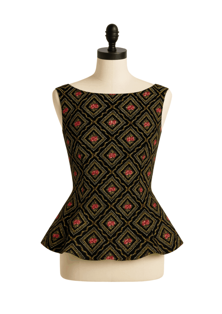 Lo scollo a barca ridefinisce la parte superiore con un tocco sofisticato, mentre il tessuto della gonna viene rimodellato in nuove linee: tagli sapienti che donano volume e movimento alla parte bassa del capo. Il risultato è un top moderno e ricercato, capace di dare nuova vita a un tessuto prezioso e di raccontare una storia tutta nuova.